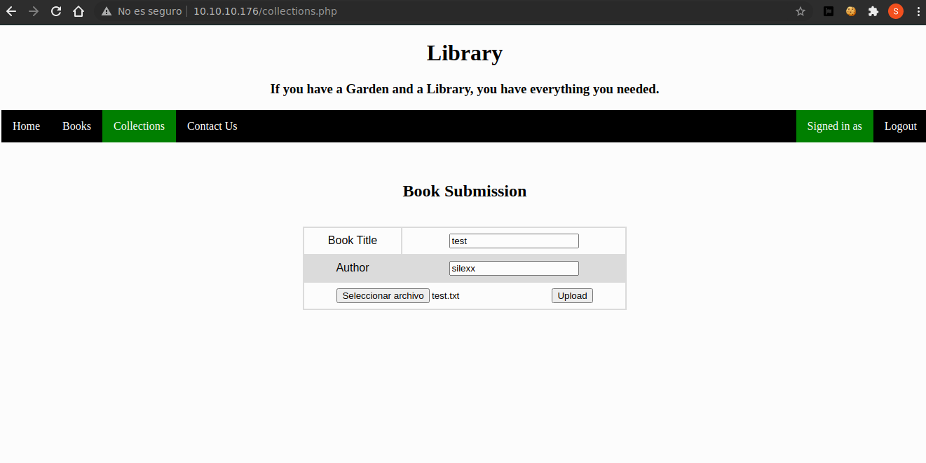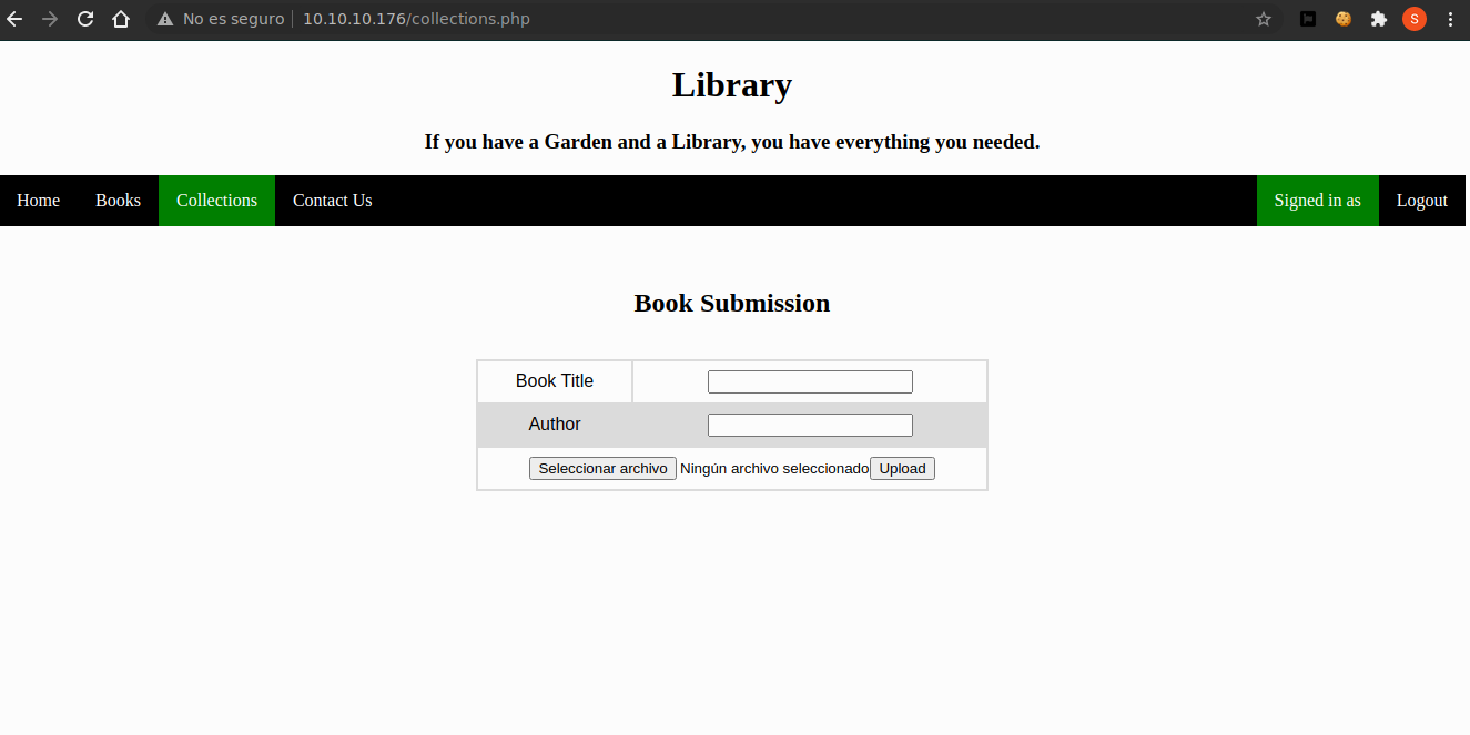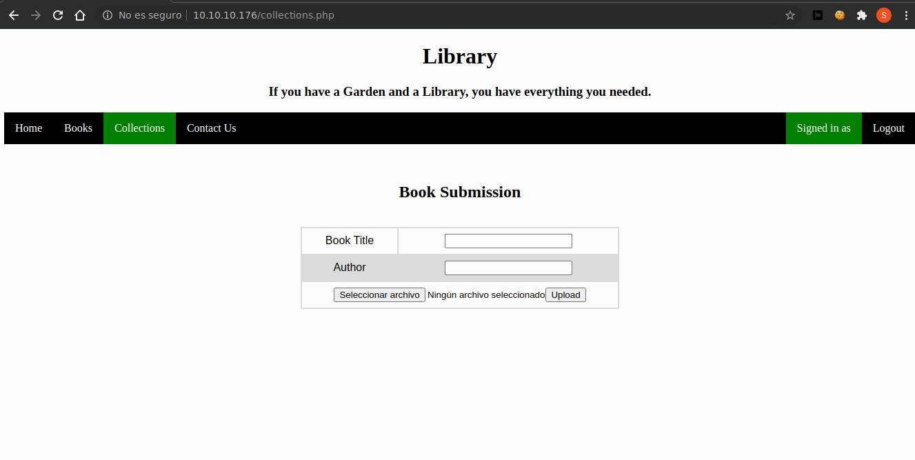 Los usuarios pueden subir archivos en http://10.10.10.176/collections.php.