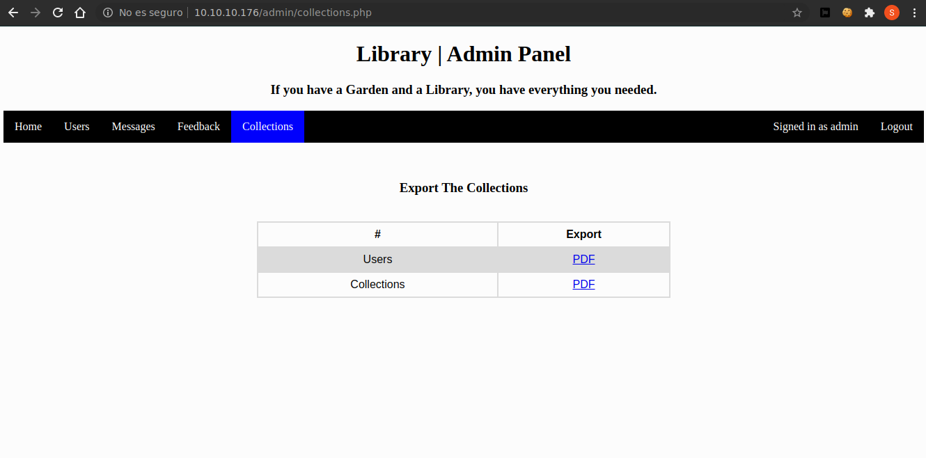 Enumerando el panel admin encontramos que podemos descargar los archivos subidos por los usuarios en http://10.10.10.176/admin/collections.php.