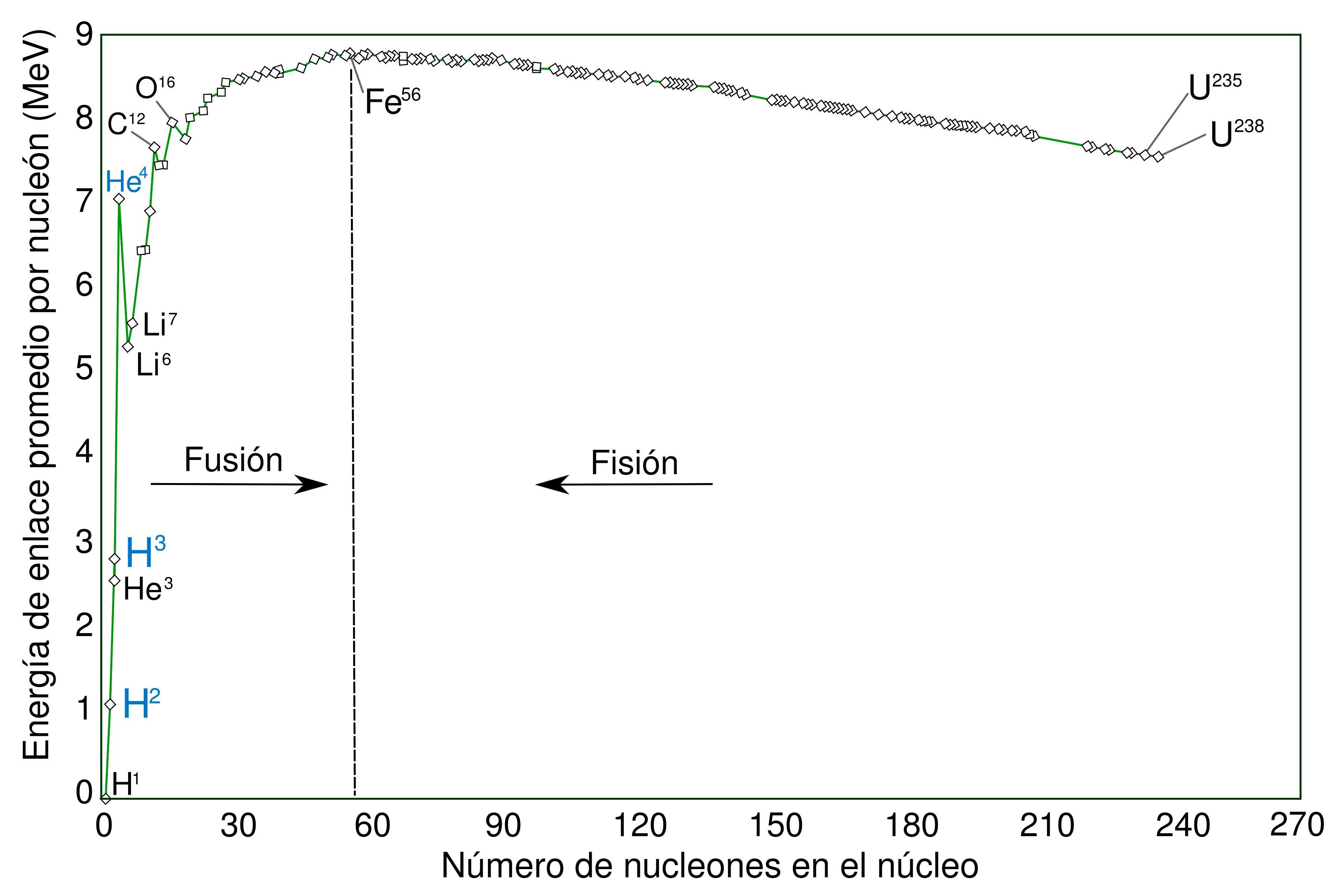 Los protones y neutrones en el núcleo se mantienen unidos por la fuerza nuclear de corto alcance. La energía requerida para desmontar un núcleo se llama energía de enlace. La figura 1 muestra que el promedio de la energía de enlace varía entre elementos; tanto los núcleos más ligeros como los más pesados tienen un promedio bajo y los núcleos de masa intermedia tienen la mayor energía de unión. Esto muestra que la energía nuclear puede obtenerse tanto por la división de núcleos pesados (fisión) como fusionando los núcleos ligeros (fusión).