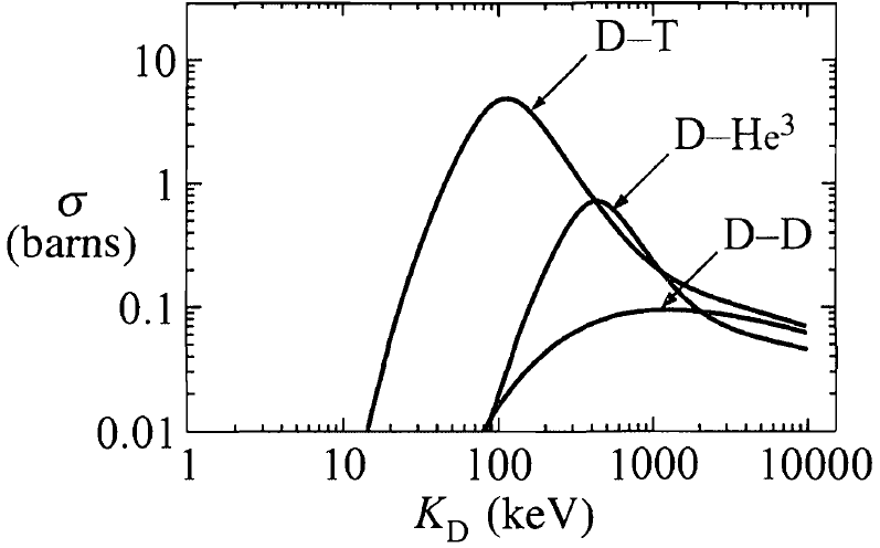 Hoy en día, generalmente, se acepta que la forma más factible para la producción efectiva de energía con fusión nuclear es calentar los combustibles de fusión a alta temperatura, para que las partículas se acerquen con un fuerte movimiento térmico y una reacción nuclear pueda tener lugar. A tan alto nivel de temperatura, los combustibles de fusión están ionizados y en un estado llamado plasma. La figura 2 muestra las secciones transversales (probabilidad de que ocurra una reacción nuclear) de diferentes reacciones nucleares. Podemos ver que la reacción más prometedora es entre el deuterio y el tritio produciendo el neutrón y una partícula $\alpha$.